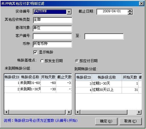 查詢方式有兩種:移至、查詢。查義界面如圖3-34所示。賬齡段城要用戶手工錄入。您可以根據自已的需要設置查詢條件,請參見《公共操作手冊》’相關內容