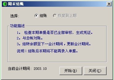 1、 結(jié)賬:在如圖3-4所示的界面上選取結(jié)賬,單擊按扭開始,系統(tǒng)自動(dòng)進(jìn)行結(jié)賬處理。無論結(jié)賬成功與否系統(tǒng)都會(huì)給出提示信息。如果提示結(jié)賬不成功。則用戶需要對(duì)當(dāng)期業(yè)務(wù)進(jìn)行檢查。