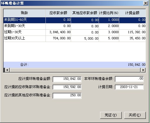 壞賬損失的計(jì)算方法,在參數(shù)中定義。計(jì)算壞賬損失時(shí),戶用只要錄入計(jì)提日期,系統(tǒng)自動(dòng)將計(jì)算結(jié)果給出。用戶對(duì)計(jì)算結(jié)果不可以維護(hù)。在如圖3-1所示的界面由單擊憑證按扭,系統(tǒng)自動(dòng)生成一張憑證,并將憑證傳遞到總賬。