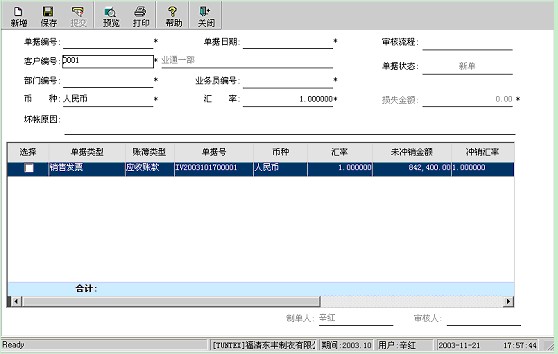 發(fā)生損失的記錄的業(yè)務員,選定壞賬記錄后,系統(tǒng)自動帶出原業(yè)務員,但用戶可以維護。 |