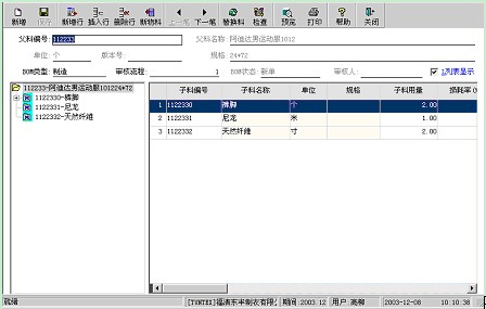 以多層樹形結構的形式對物料的產品結構進行顯示,同時提供維護功能,系統左邊樹形結構顯示了物料的各層次的子料組成情況。主要提供給制造系統及物流、財務系統進行物料需求計算及成本分析時使用。如為報關