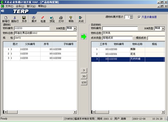 BOM類型,系統將自動展開第一層結構,輸入要生成產品結構的物料編號和BOM類型,選擇一個或多個子物料復制到新的產品結構中。具體步驟如下: