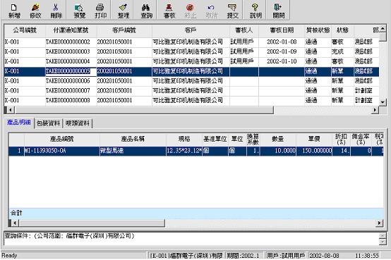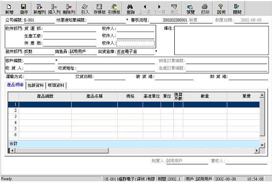 在此錄入付運的產品﹑單價﹑數量﹑金額等﹐必輸﹐可從訂單引入。 |