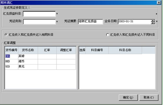 用戶可以手工錄入期未進(jìn)行調(diào)匯的匯率、選擇需要進(jìn)行調(diào)匯的會計科目。系統(tǒng)默認(rèn)的匯率是用戶已在貨幣維護(hù)中已定義好的對應(yīng)貨幣的匯率、會計科目是已設(shè)定好科目的貨幣屬性這核算所有幣種的會計科目。