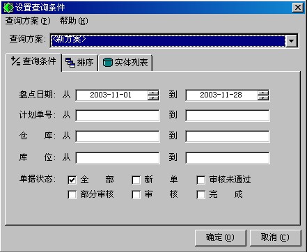 2. 點(diǎn)擊工具欄中的新增或菜單欄中的[文件\新增盤點(diǎn)計(jì)劃],彈出如圖條件輸入窗口
