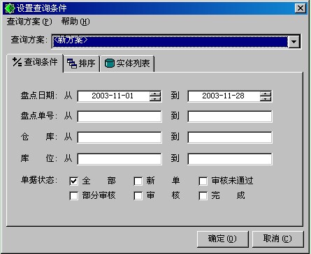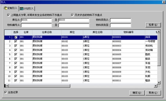 b.引入窗口默認為定制引入,如圖,錄入物料、庫位、物料類別的范圍,并設置好參數,然后點查詢,系統自動根據參數,顯示出指定范圍內的物料,把不要盤點的物料記錄的前面的勾去掉后,按確定。盤點表主界面就已經顯示了引入時打上了勾的物料。