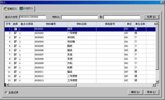 c.如果選擇計劃引入,則界面如圖,選擇盤點計劃,錄入物料范圍后,點檢索,系統自動顯示出盤點計劃中本倉庫的在指定范圍內的物料記錄。把不要盤點的物料記錄的前面的勾去掉后,按確定。盤點表主界面就已經顯示了引入時打上了勾的物料。