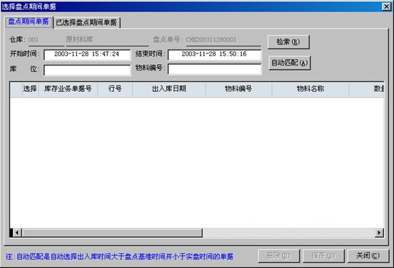 2. 選擇盤點期間單據:點擊菜單[文件\選擇盤點期間單據]或工具欄的 ,系統彈出下圖的窗口,窗口中列出了盤點表中的物料在盤點基準日期至今的所有出庫、入庫單,在相應的單據前打上勾后按保存。