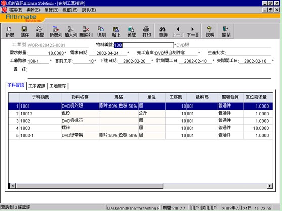 BOM)、工藝路線生成對該工單的子料需求明細(xì)和工序加工明細(xì);并允許用戶對具體資訊進(jìn)行修改。但要注意保持: