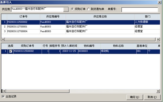 6. 根據供貨商的送貨單上的物料記錄,在明細窗口中的對應物料的‘選擇’欄打上勾。