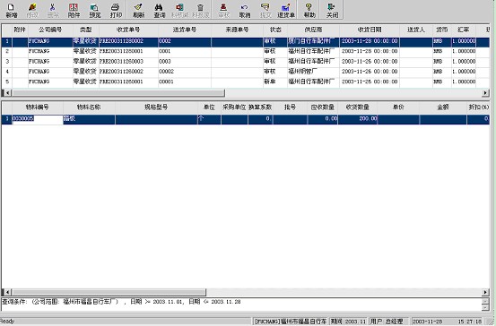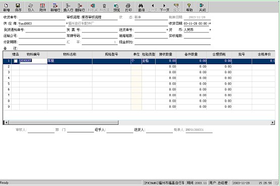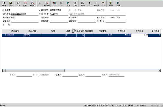 10. 點擊工具欄的保存或選擇[文件\保存]。收貨單錄入完成。如果是外協收貨單,在收貨時自動會按’料核銷’與’料報廢中的信息自動扣減供貨商處的庫存.
