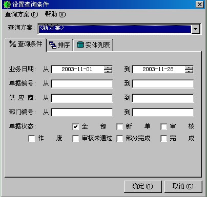 系統為收貨單提供了日期、單號、供貨商、部門、單據狀態幾個查詢條件,如下圖: