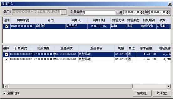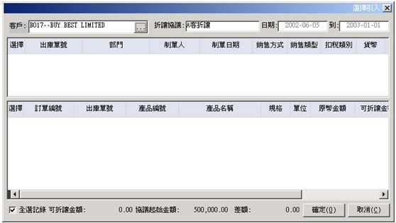3. 如果折讓類型為普通折讓﹐則顯示如下圖的引入窗口﹐可以按銷售訂單過濾出出庫單﹐選定要進行折讓的出庫單及產品記錄﹐按確定﹐所選記錄會引入到折讓單錄入主接口來。