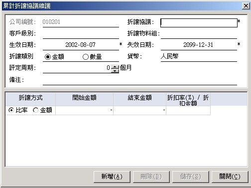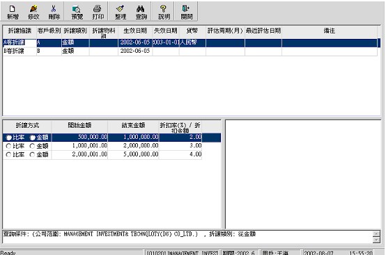 對不同級別的客戶中的折讓是不同的﹐必須先定義客戶級別﹐并在客戶資料中維護(hù)好客戶級別。 |